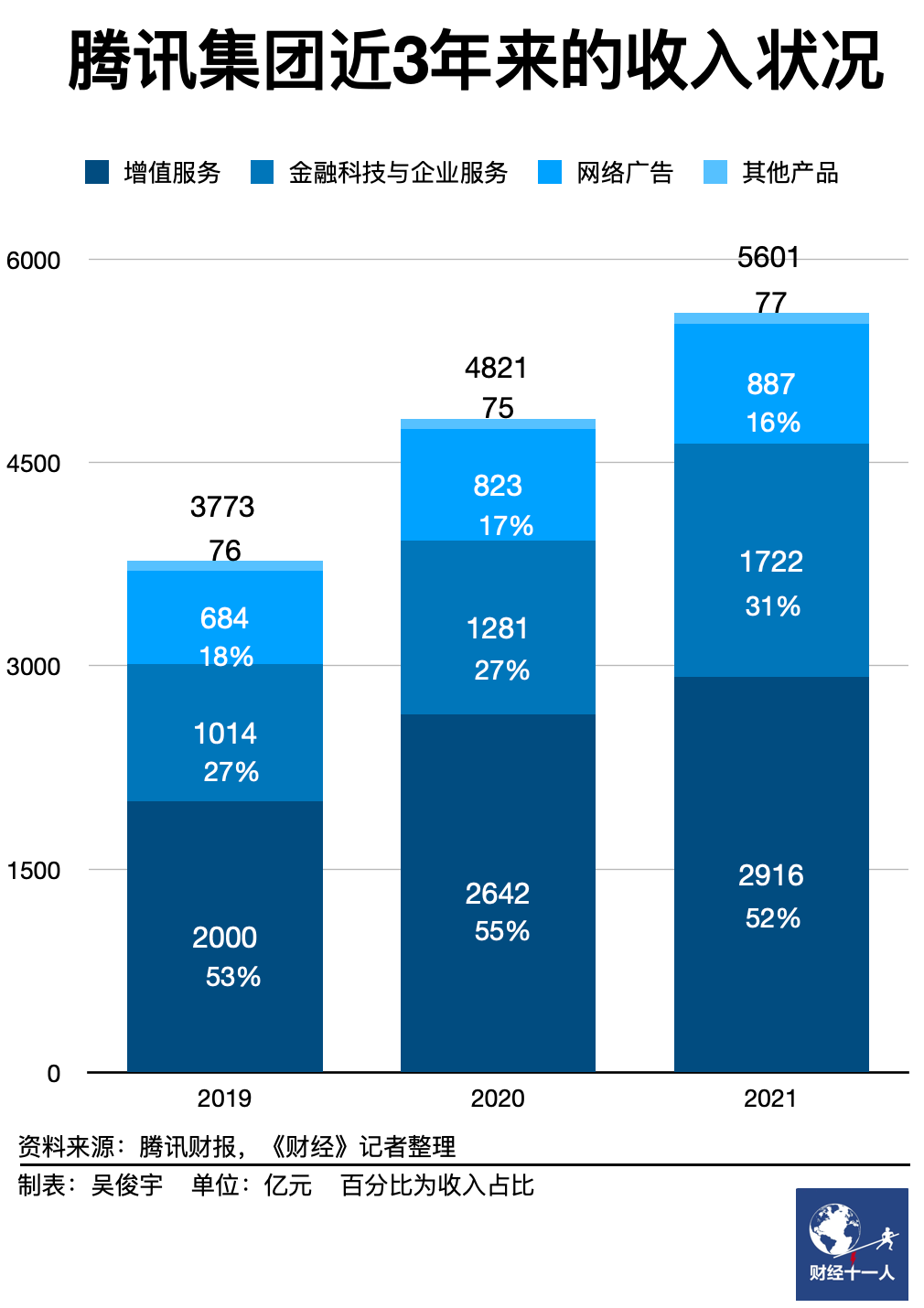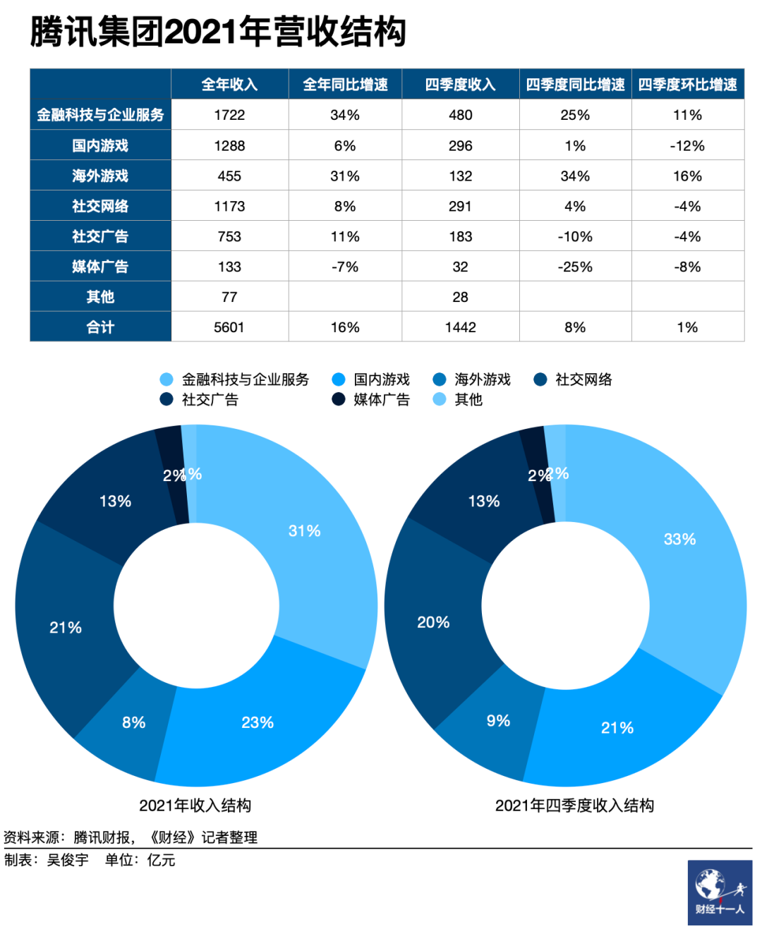 “一升”,金融科技与企业服务(外部称腾讯的ToB业务)表现稳健,2021年营收同比增长34%,达到1722亿元。2021年四季度,该业务在腾讯总营收中占比33%,超过了占比30%的游戏业务,首次成为腾讯的第一大业务。