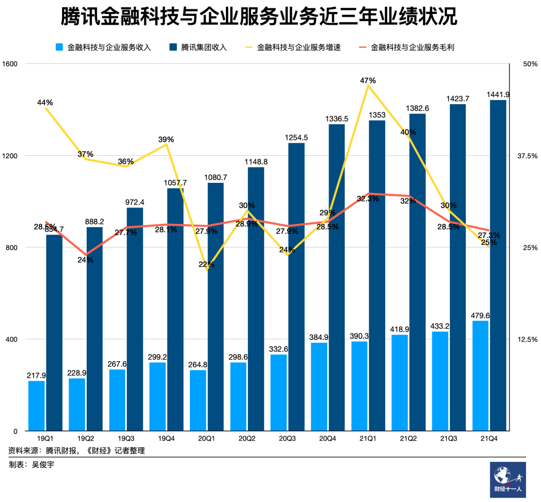 腾讯金融科技与企业服务业务2021年出现收入增速、毛利率下滑趋势。收入增速从2021年一季度的47%滑落到了四季度的25%。毛利率从2021年一季度的32.3%滑落到了四季度的27.3%。毛润率下滑的原因是什么?腾讯财报解释是,金融科技支付金额增长导致交易成本的增加,以及对云计算专业人才和运营的持续投入。