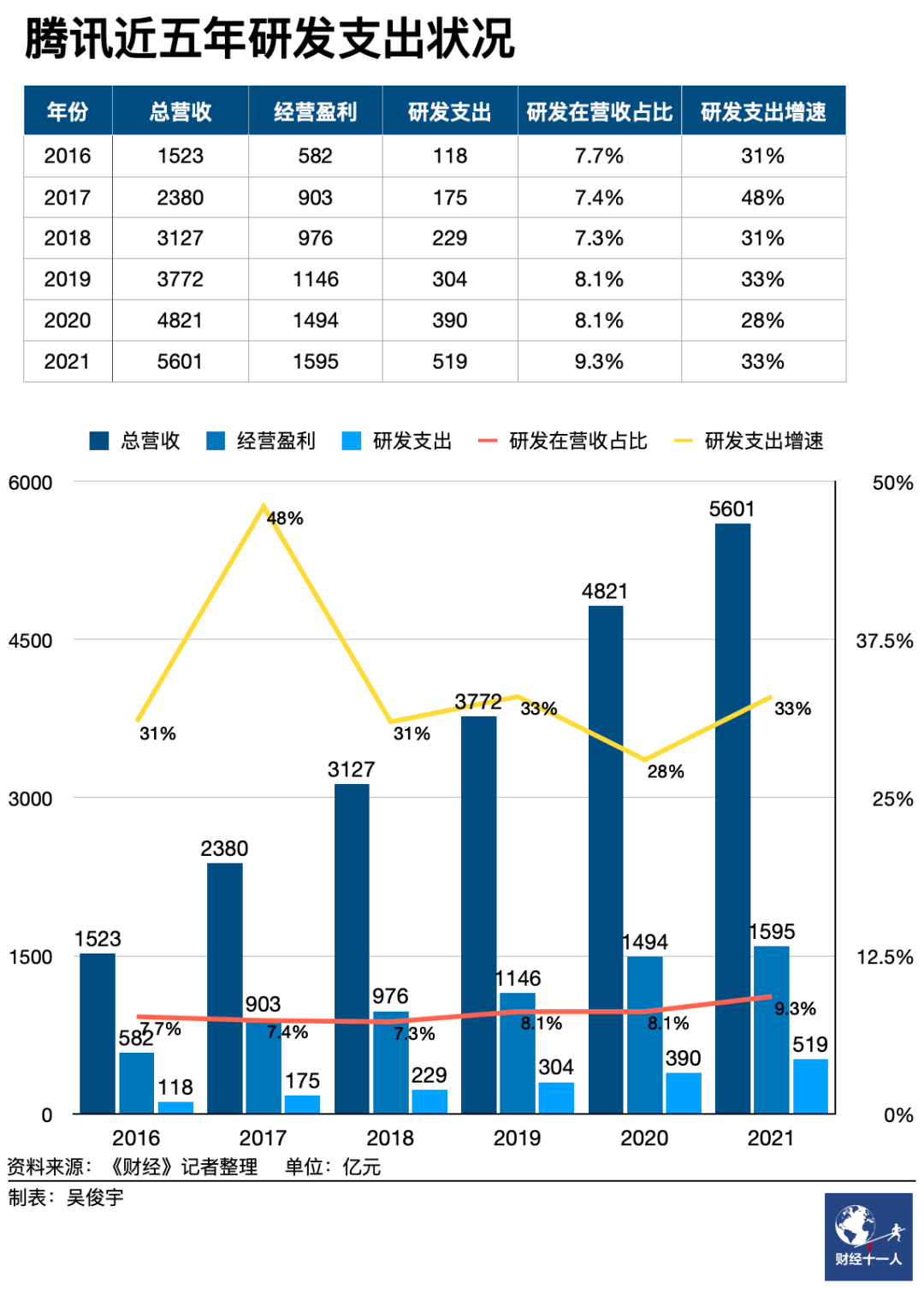 腾讯财报显示,2021年其研发支出为519亿元,同比增长33%。研发支出在营收中的占比为9.3%,为历史最高。腾讯财报解释,2020年-2021年专业人才招聘激烈,预计将在2022年得到缓解。