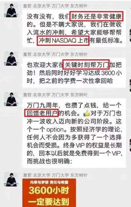 多位员工和学员讨论,感觉这件事像是跑路前的蓄谋。豆豆告诉深燃,这个奖学金班一经推出,就有不少学员在群里质疑,说这种操作类似健身房圈钱跑路。“然后童哲就出来安抚军心了,说是九周年了,万门赚了点钱,要回馈用户。再加上万门准备在纳斯达克上市,请大家帮忙冲一冲数据。”