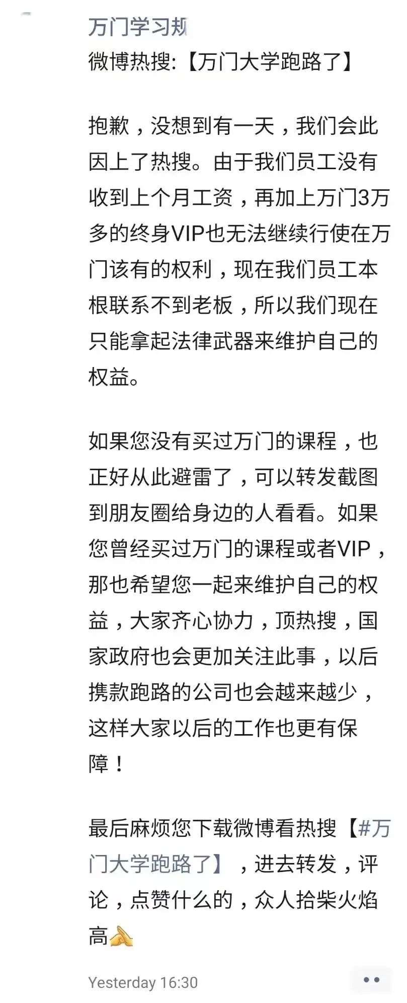 目前,多位小万君都在朋友圈和其他社交平台发布同一段文字,讲述万门疑似跑路、欠薪欠社保的情况,并且号召学员和员工们一起转发,向外扩散,争取让更多人看到这件事情。一些员工也已经报警,还有人奔走在律所和房管局之间,试图找到一些止损的方法。