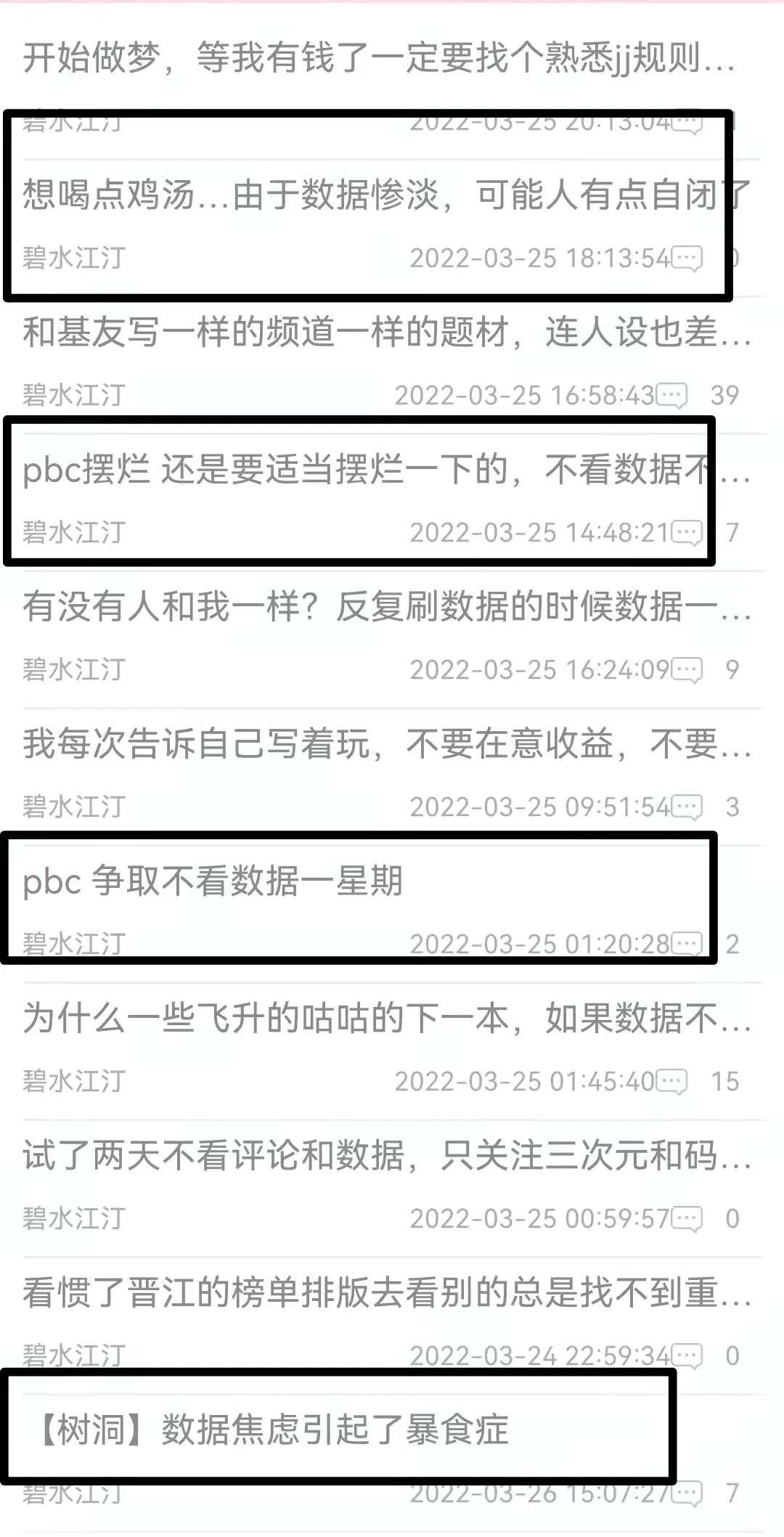 在晋江文学城的论坛中,更多的作者在论坛感慨自己数据的“凉凉”。