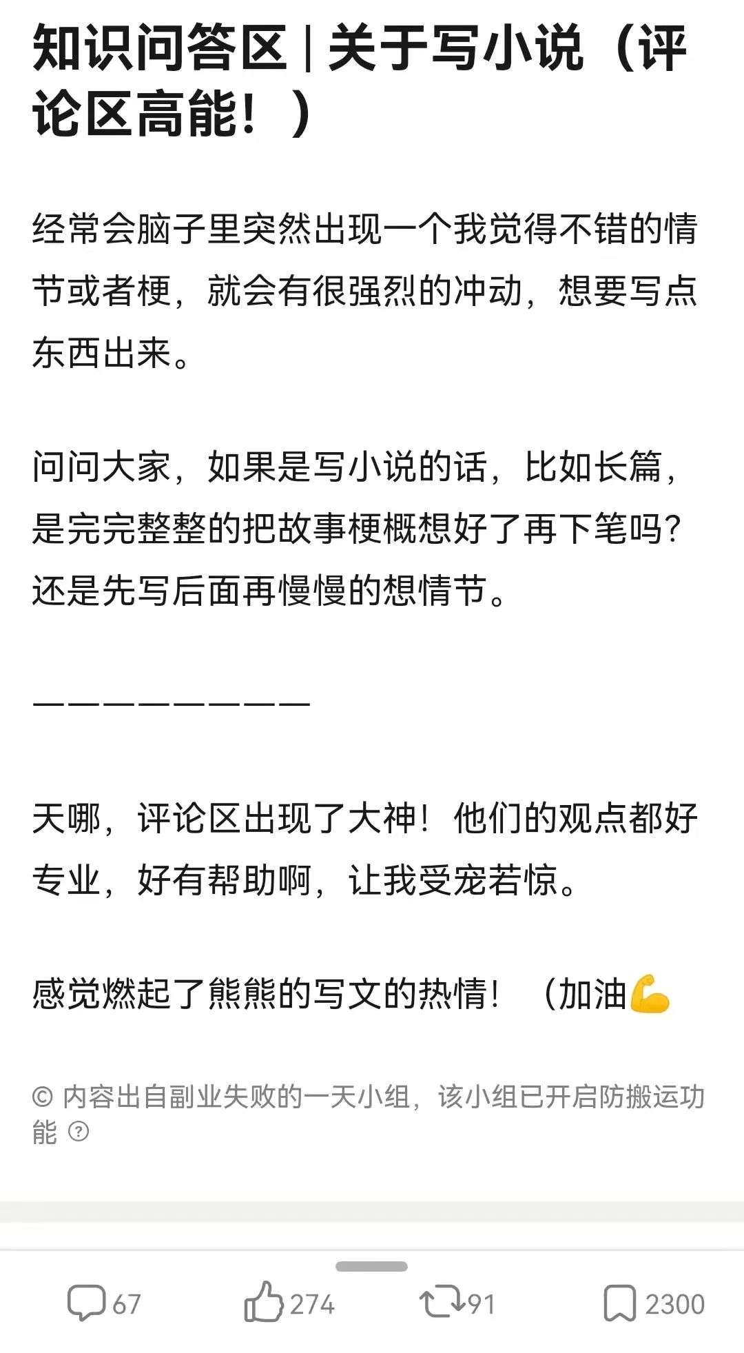 在豆瓣“副业失败的一天”小组中,也时常出现“打算写个小说做副业”“关于在XX平台写小说的记录贴”“大家帮我看看有没有资格小说”等帖子。