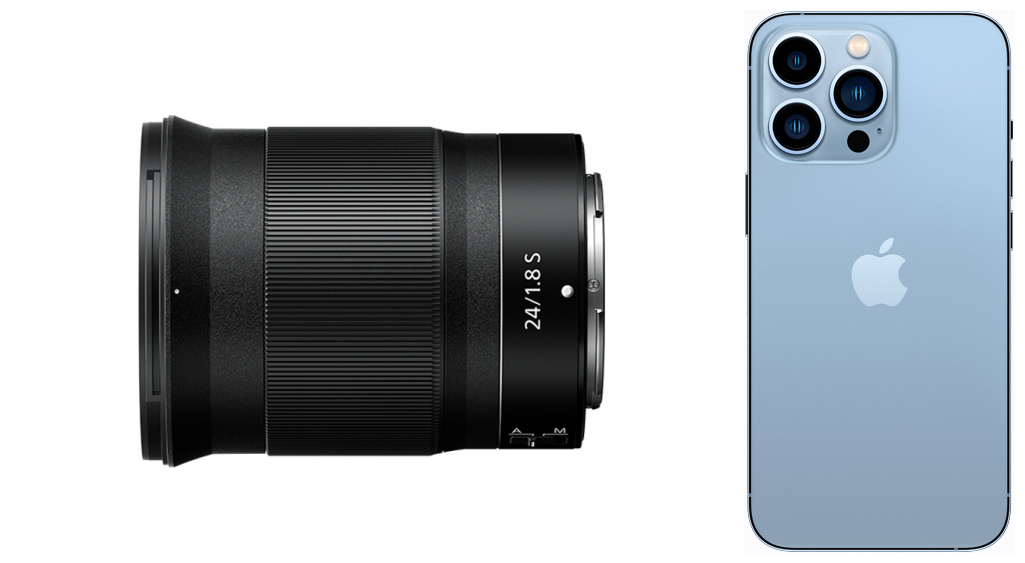 在下面这组图中,左边是一颗尼康 Z 24mm F/1.8 镜头,右边则是一台 iPhone 13 Pro Max,它的主摄搭载了一颗光圈为 f/1.5 的镜头。