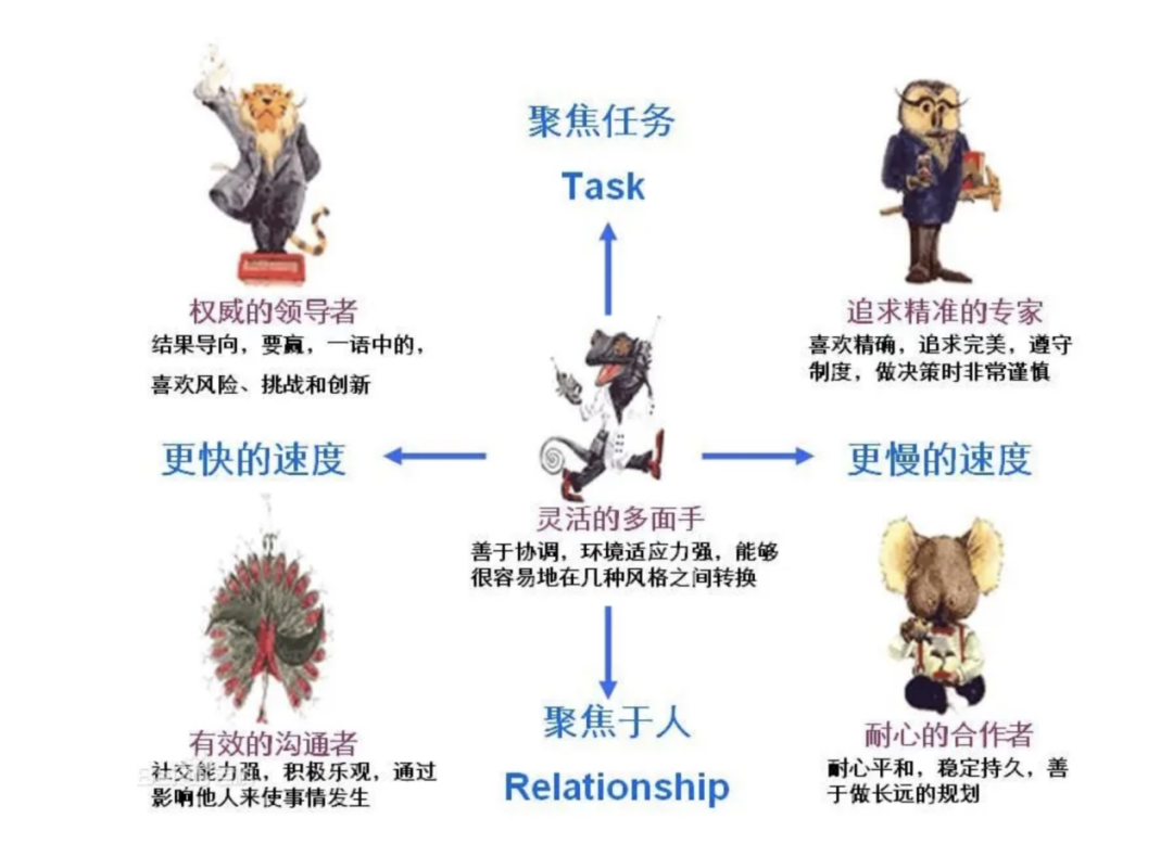 彼时,受到学界广泛认可与应用的理论工具被发明出来。较为出名的 PDP 性格测试系统(Professional Dynamitic Programs 专业活力能量衡量系统),又演变为五种动物性格测试,将人分为老虎型(支配型)、孔雀型(沟通型)、考拉型(耐心型)、猫头鹰型(精确型)、变色龙型(整合型)。流行的还有荣格的“八分法”、起源于宗教教义的“九型人格”等。