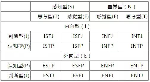 荣格曾在《心理类型》一书中提出,人类主要使用两种维度下的四种心理功能来体验世界——实感(S)/直觉(N)、思考(T)/情感(F),每种功能又有两种体现——内向(I)/外向(E),共计八种心理类型。母女俩在此基础上增加了一个维度:判断(J)/感知(P),从而将人格划分成了 16 种。