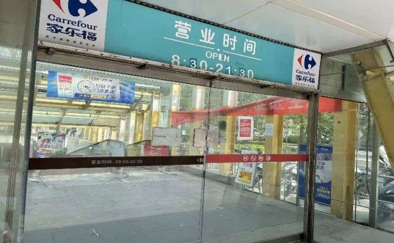 坐标热闹的中关村广场,这家沿街开设的超级大卖场——家乐福,门口上方的招牌和营业时间的提醒信息还未摘下,门内的宣传海报和横幅也依旧醒目,但紧闭的店门,却昭示了往日热闹景象已不复存在。