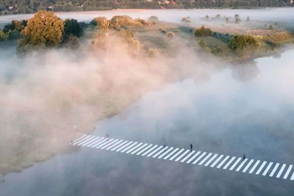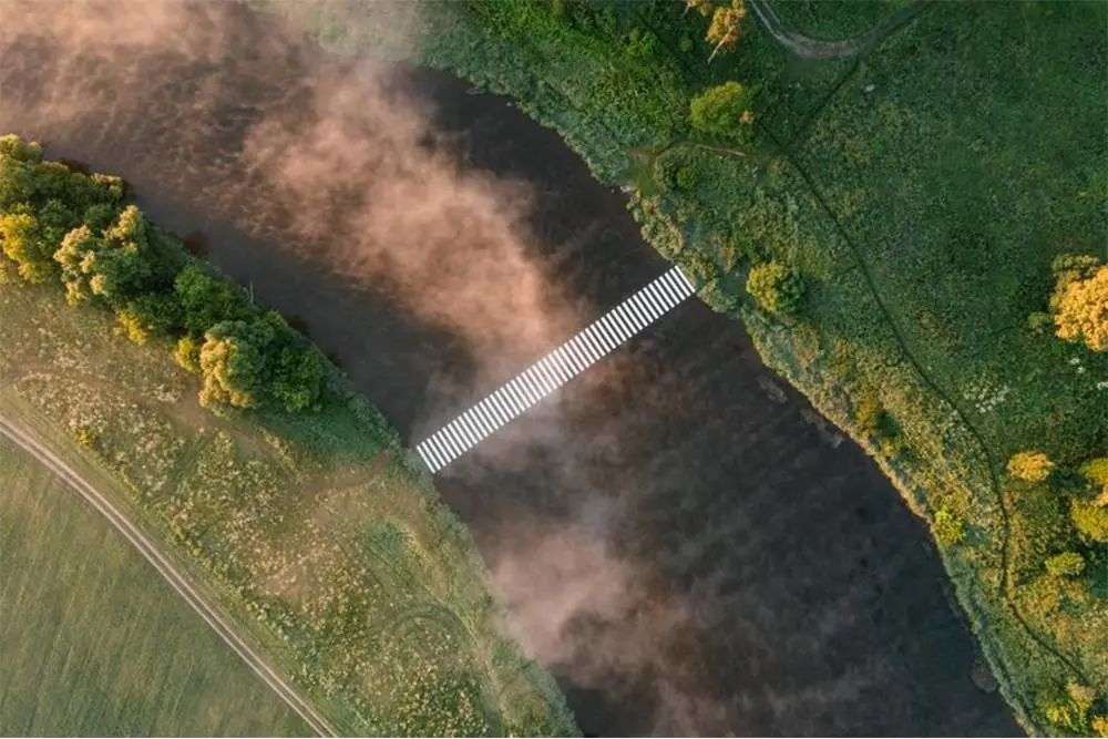 从这一点出发,俄罗斯艺术家 Gregory Orekhov 将普通的黑白斑马线,移到了莫斯科河之上,做成了大型艺术装置。