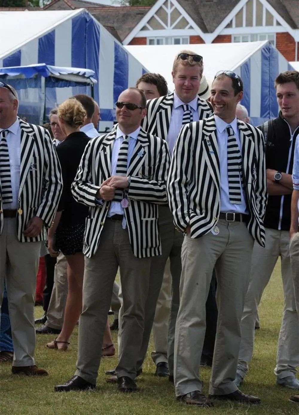 这场活动中,一些游艇俱乐部和颁奖典礼工作人员,都会定制代表自己的套装。穿着疑似「人行道鉴别协会」套装的这几位男士,事实上来自有 136 年历史的 Molesey 游艇俱乐部。