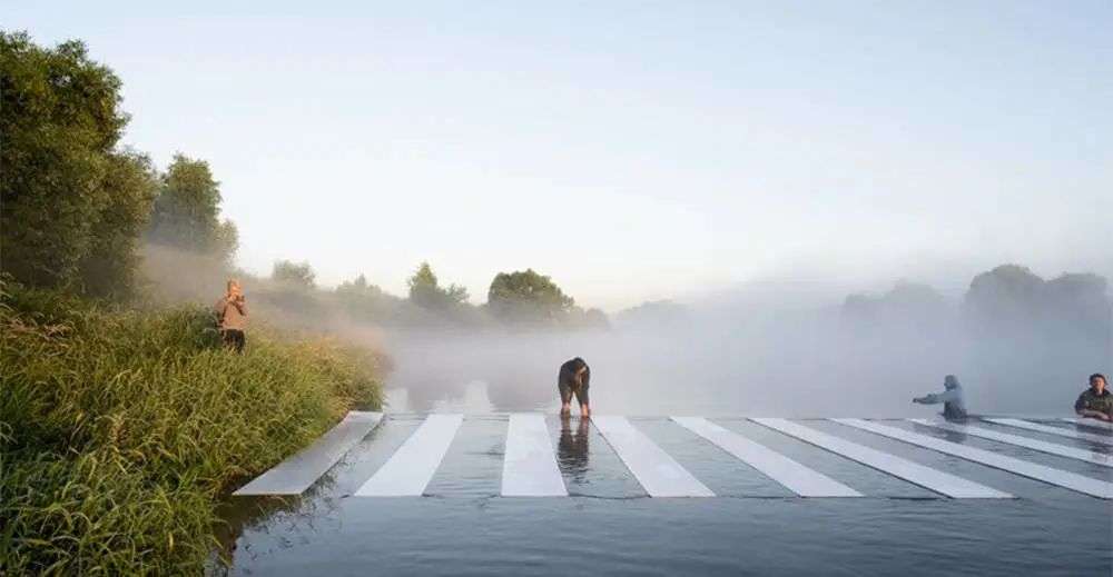这确实是一条可供行人穿越的斑马线人行道。看似浮在河面上的白色斑马线,其实是刷在透明的聚碳酸酯片上的白漆。