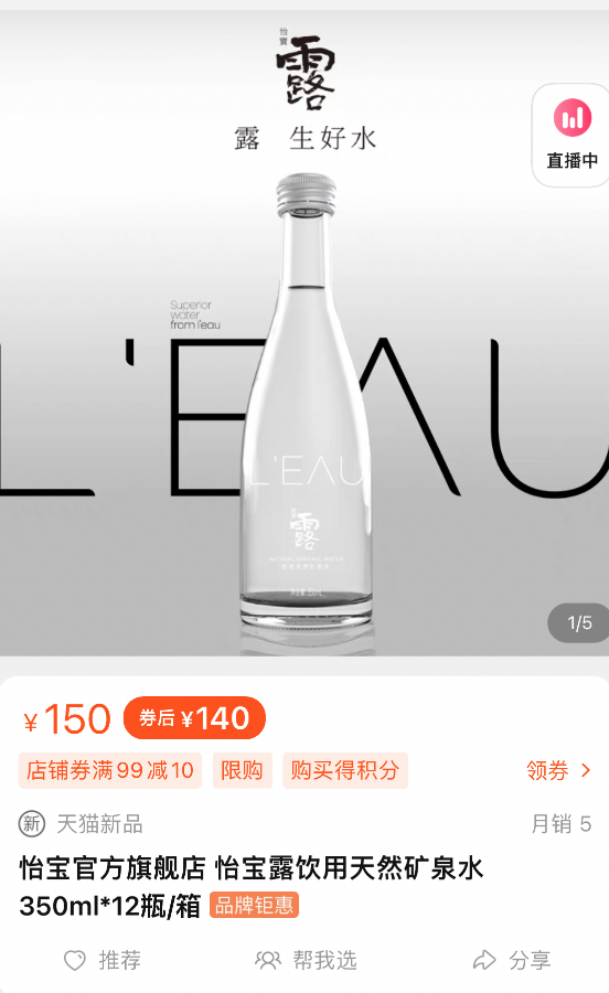 2022年4月,华润怡宝上线高端天然饮用矿泉水——怡宝“露”。时代周报记者发现,作为华润怡宝首个高端矿泉水品牌,24瓶装的怡宝“露”每箱售价约为150元,平均每瓶350ml装的单价大约是6.3元左右。截至4月19日,该产品在怡宝淘宝官方旗舰店的月销量仅是个位数。