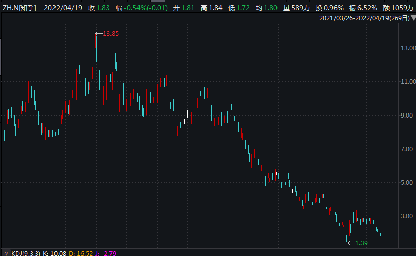 万千宠爱的知乎,将在本周五(4月22日)于港交所挂牌。和不到一年前相比,知乎美股股价从高点13.5美元跌至1.83美元,最低曾跌至1.4美元左右,回撤近九成;即便和发行价9.5美元相比,现股价破发超过八成。