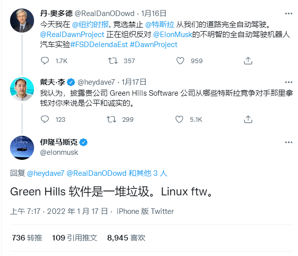 有网友指出,他的Green Hills Software其实与特斯拉存在竞争关系,而这家老牌企业在竞争中并不占有优势,因此他就希望通过“政治广告”的方式打压特斯拉。