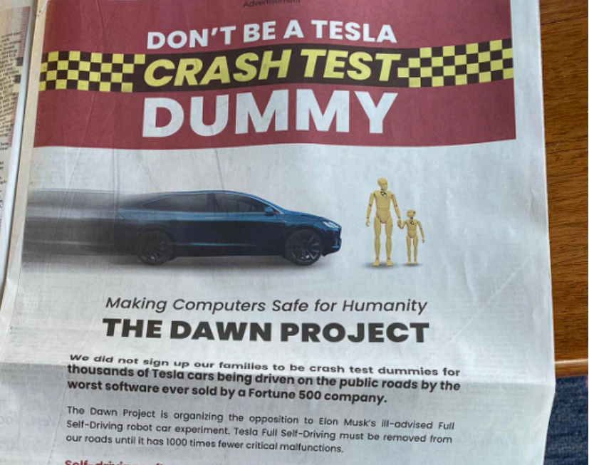 早就今年1月,一家名为The Dawn Project的组织向纽约时报投递广告,呼吁用户不要成为特斯拉全自动驾驶汽车的碰撞测试假人,而这个组织正是奥多德创立的。
