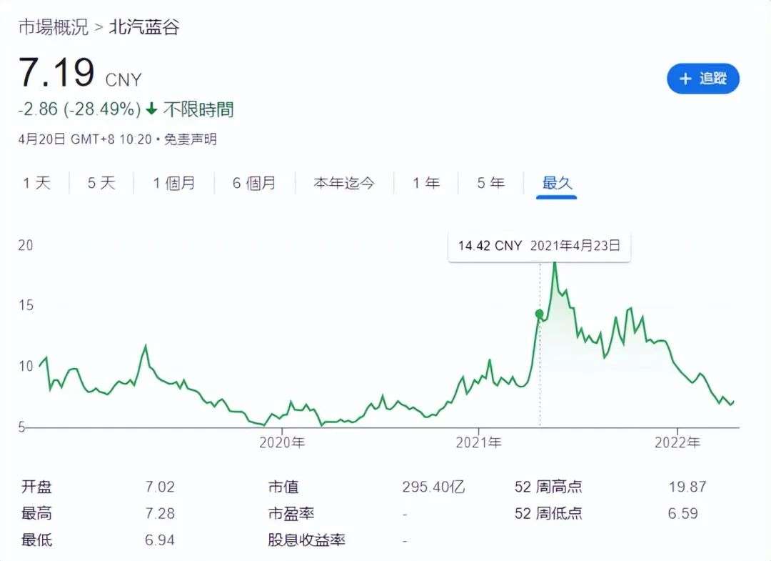 从北汽蓝谷在二级市场的表现,我们同样可以窥见对这一观点的现实性支撑,在去年极狐阿尔法S发布的时间点上,北汽蓝谷股价快速冲到了这几年的最高点,一度超过19元人民币。