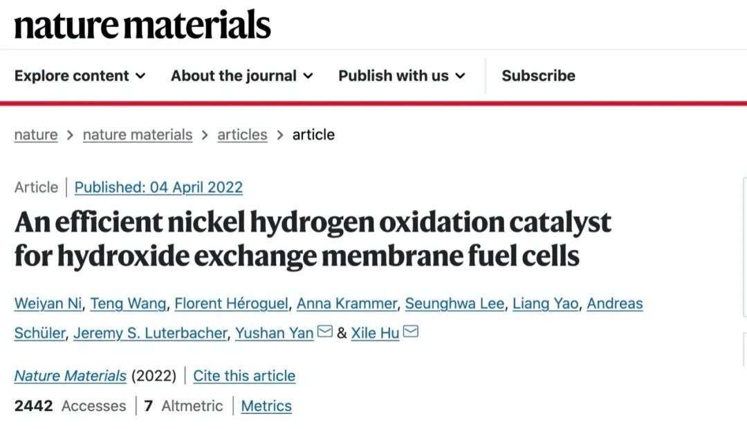 这篇发表在Nature子刊上的论文,合成了一种新型镍催化剂——Ni-H?-NH3,比活性达到了70μA/cm2,在所有无铂催化剂中排名第一。