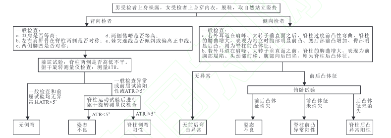 评估者平视背部,从头到腰部扫视脊柱,观察两侧脊柱是否同高。如果在实验过程中出现背部任何不等高的情况,则提示存在椎体旋转,高度怀疑存在脊柱侧弯,这时就需要进行下一个测试以确定结果。此外,在一般检查时若出现双下肢不等长的受检者应采用坐位进行前屈试验。前屈试验如图所示。