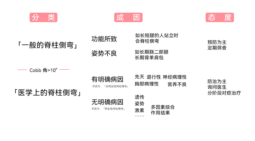 两种脊柱侧弯的成因不同。对于一般的脊柱侧弯病因主要有两种:一种是不良姿势导致的,这也是我们最熟知的原因;另一种是因为长短腿导致的脊柱侧弯。一般的脊柱侧弯又可能会导致医学上的脊柱侧弯,但单纯的姿势不良和长短腿并不一定会导致严重的脊柱侧弯,医学上的脊柱侧弯病因更加复杂。