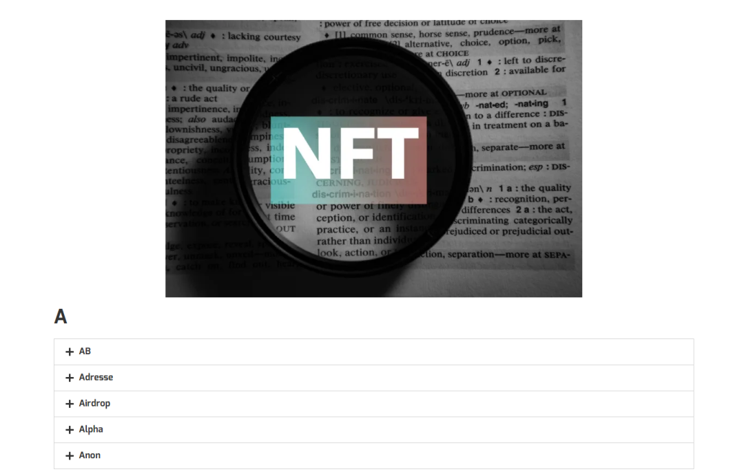 “新手词汇表”则按照字母顺序,为用户列举了近百个NFT领域的关键词。如“加密艺术”(Crypto Art)、“交易平台(Marketplace)”、“代币化”(Tokenize)等。