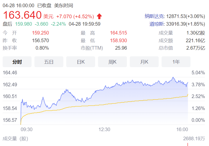 苹果依旧“吸金”,一个季度1657亿元净利润,相当于每天都能挣18亿元。截至发稿前,苹果股价涨4.52%报收163.64美元,总市值2.67万亿美元,约等于6个腾讯。