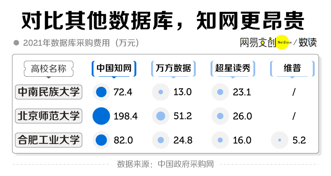 2021 年,合肥工业大学一口气购买了中国知网、万方数据、超星读秀、维普四个数据库,其中知网的费用达到 82 万元,而万方数据不过才 24.8 万,不到前者的三分之一。