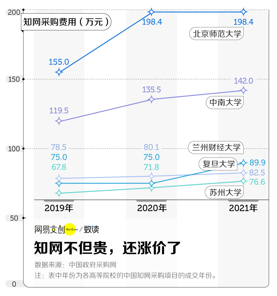 2019 年,中南大学采购知网数据库时,中标金额为 119.5 万元,2021 年就攀升到 142 万元。