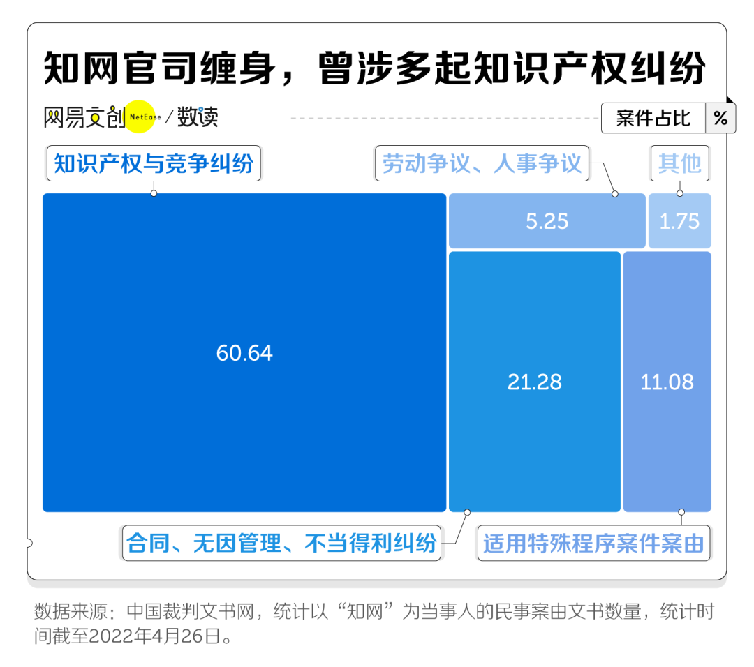 据裁判文书网,截至 4 月 26 日,以“知网”为当事人的法院文书中,6 成案件的案由都是知识产权与竞争纠纷。还有 21% 的案件是知网因为合同、不当得利等纠纷被起诉。