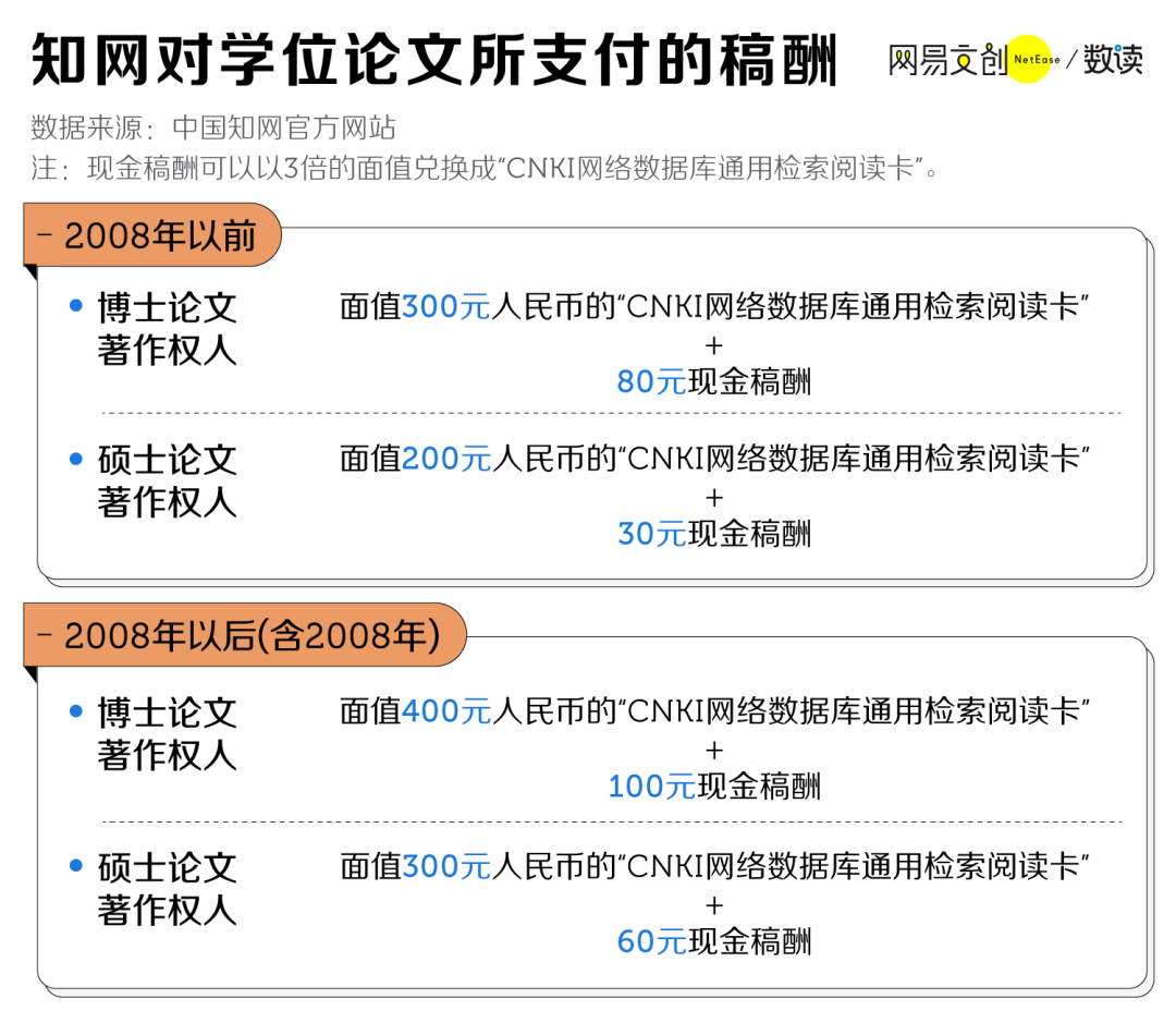 而且,知网并不会因为电子出版获得的利润而额外付给论文著作权人回报。支付给硕博论文作者的费用标准更是完全由知网自身决定,金额少得可怜 [10]。