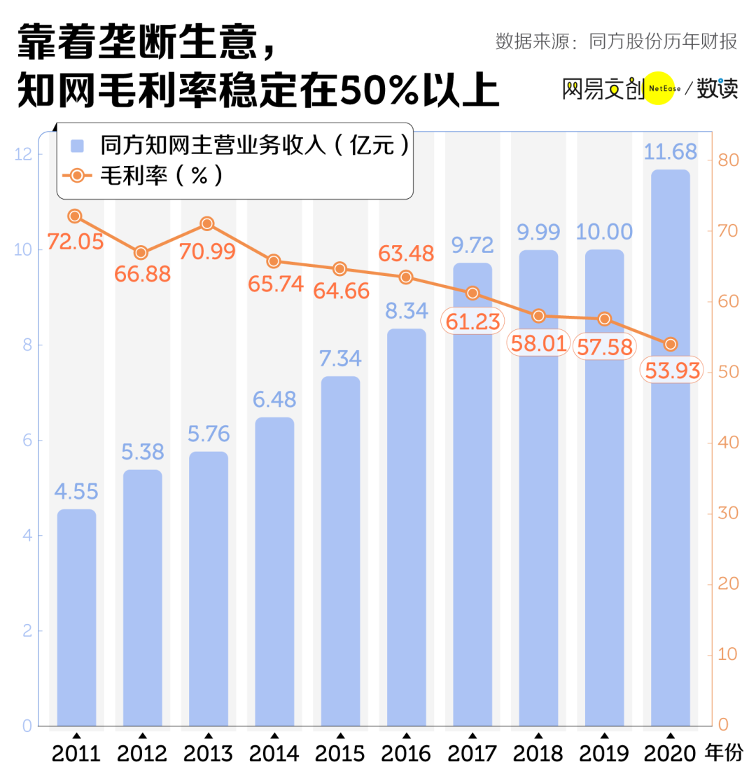 凭借着这样的高收费,知网的生意赚得盆满钵满,年毛利率稳定在 50% 以上,是控股公司同方股份最赚钱的子公司之一。