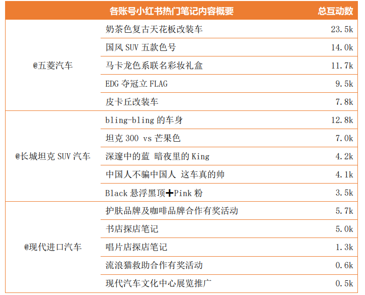 内容细节有侧重。多分享DIY,个性化涂装、精致内饰、独特部件(如@五菱汽车“奶茶托”)等内容,有利于加强对车型时尚感、独特性的包装。