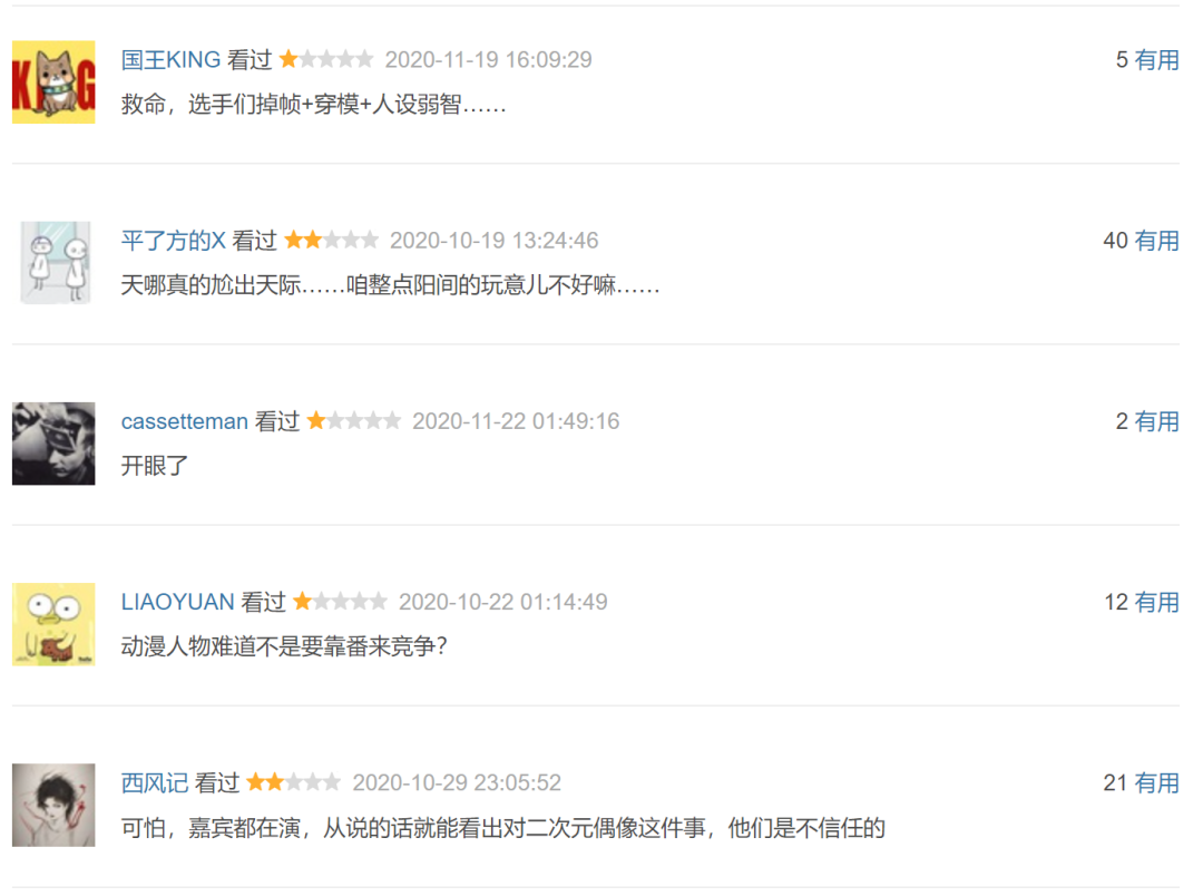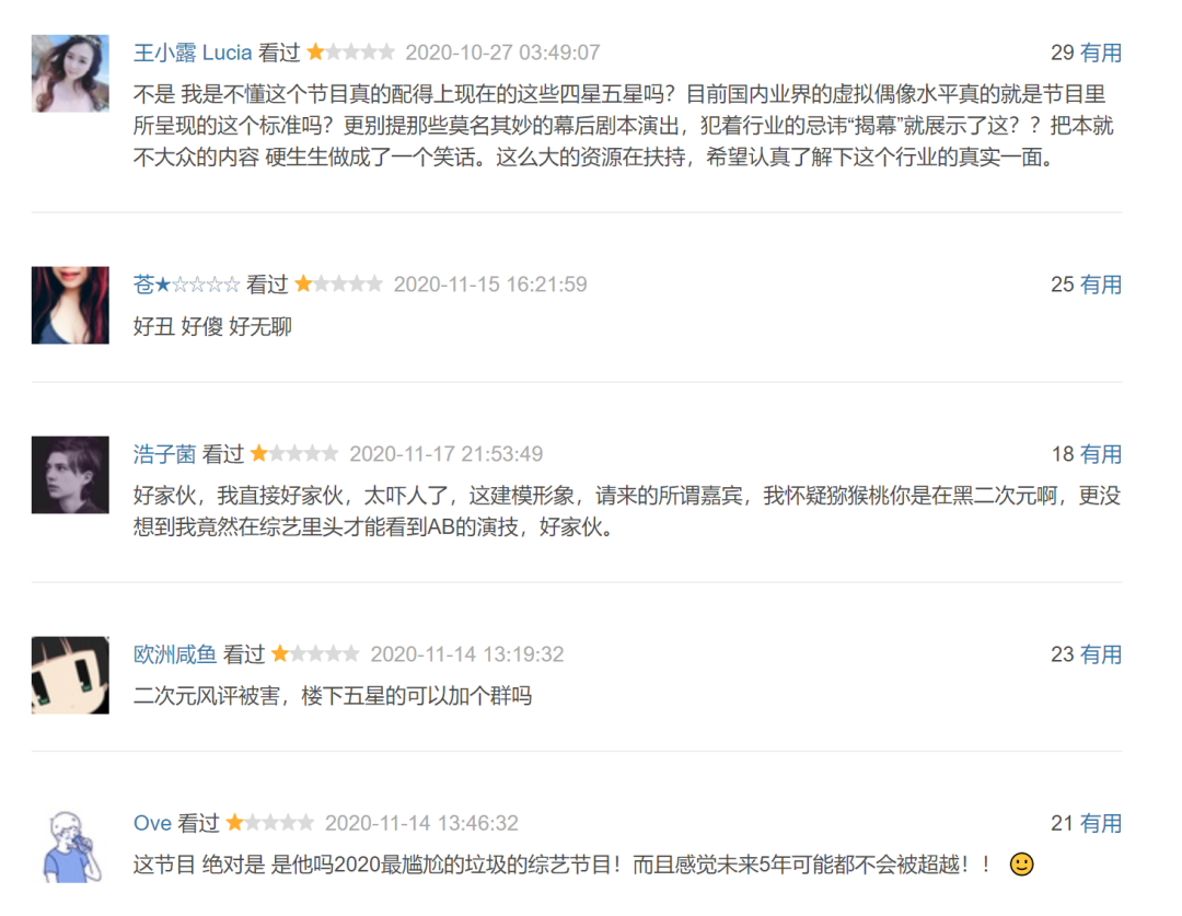 节目播出时一度被水军刷到7分以上的豆瓣评分,如今也已经回落到了4.5分。下面诸多网友的评论反映着观众的真实想法: