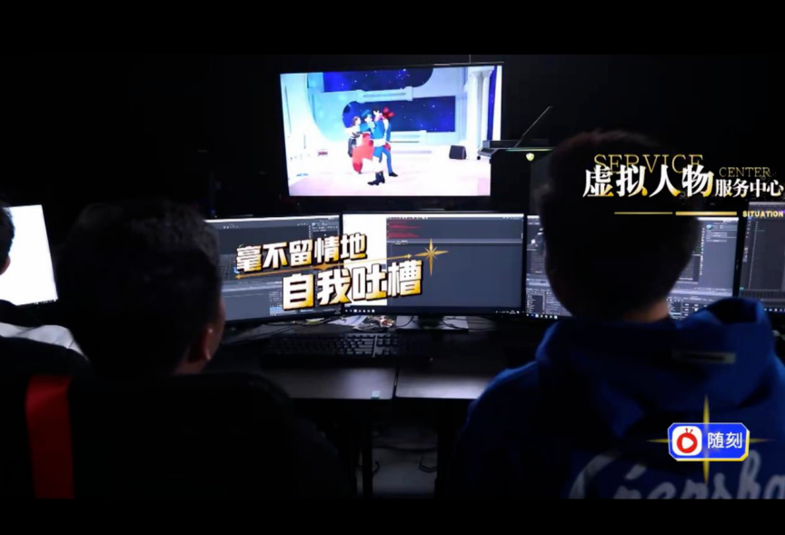 整档节目首先运用的技术便是动作捕捉:技术人员通过在中之人身上标记反光mark点,利用光学捕捉系统把动捕实时数据接入CG引擎实时3D渲染从而进行节目录制,让嘉宾可以在现场与虚拟人物直接互动。
