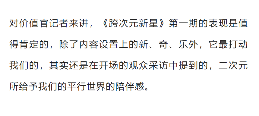 但这个节目相当于抛砖引玉,它将虚拟和真人之间的隔阂膜给捅破了,让人们关注并投入到一个全新的世界,这个过程的意义才比较重大。