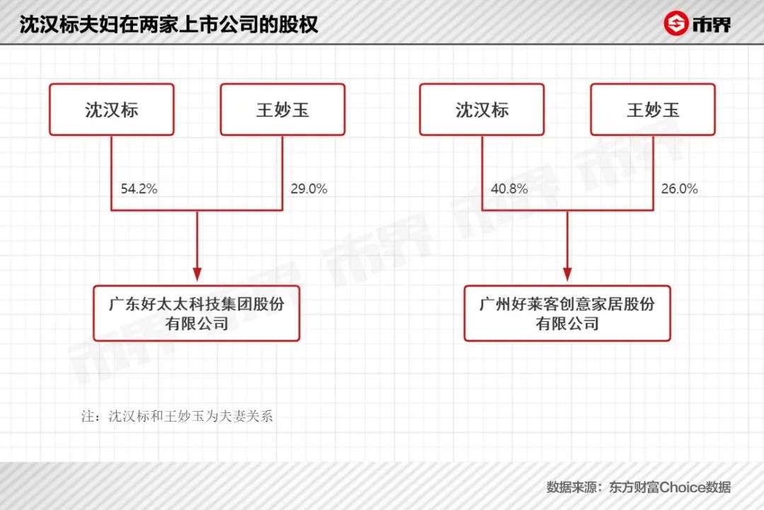 以此为起点,沈汉标夫妻干了两家上市公司——好太太和好莱客。截至4月29日收盘,这两家公司市值分别为45.4亿元和27.6亿元;按照持股比例计算,沈汉标夫妻身家达56亿元。
