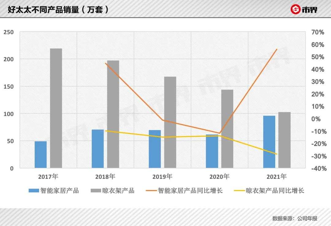 2017年到2021年,好太太晾衣架产品营收从5.5亿元,滑落至3.3亿元;智能家居产品营收则从5.2亿元,增长至10.8亿元。2021年,好太太智能家居产品营收同比增长45%。这也推动了公司整体业绩在经历了两年下滑后,重新实现增长。