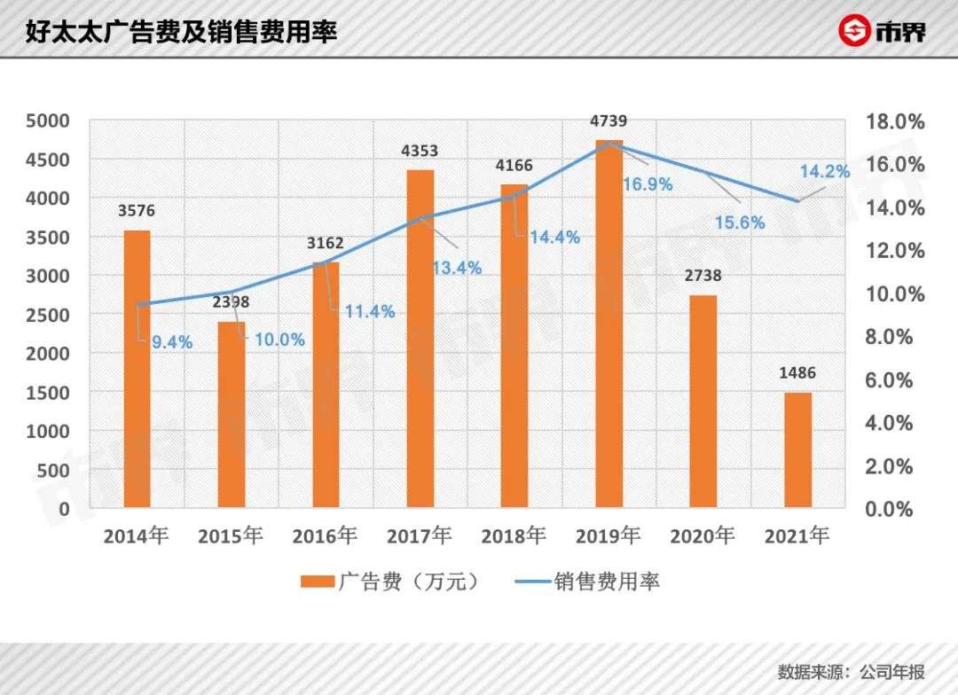 2014年到2019年,好太太广告费用基本在稳步上升,公司的销售费用率也从不到10%,增加到17%左右。