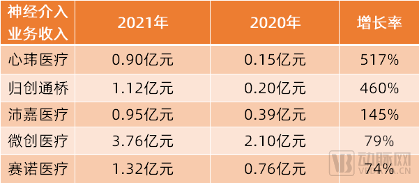 2021年,心玮医疗神经介入业务营收0.9亿元,同比大幅增长517%;而归创通桥、沛嘉医疗、微创医疗、赛诺医疗的神经介入业务于2021年也分别同比增长460%、145%、79%、74%。