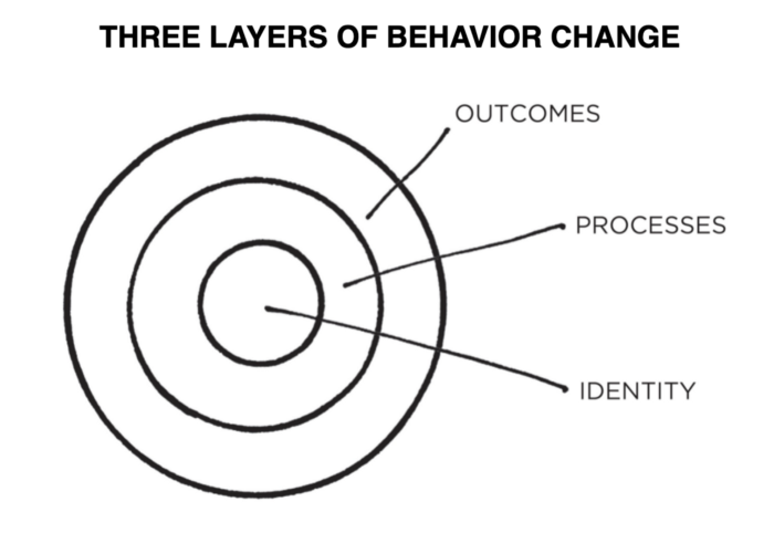 第一个层面是改变结果。例如,减肥,赢得一场比赛,或发表一篇文章。第二个层面是改变过程,这些过程也均与结果相关。第三个层面是改变身份。关于这一层面,克莱尔说了很多,因为得到你想要的结果的最有效方法是,真正地相信它是你身份的一部分。例如,他指出,如果你想成为一名优秀的艺术家,你应该说“我是一名艺术家”,而不是“我想成为一名艺术家”。通过改变身份认知,你的过程也随之改变。为了获得艺术家的成果,你会开始像艺术家一样思考,像艺术家一样行动。克莱尔多次重申这个想法: