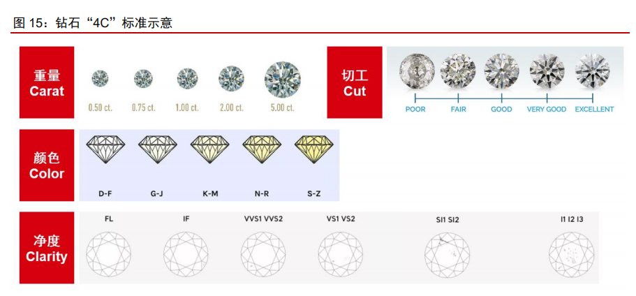 培育钻石沿用天然钻石的“4C”评价体系。“4C”是指从重量(Carat)、颜色(Color)、净度(Clarity)、切工(Cut)四个方面对钻石进行评级: