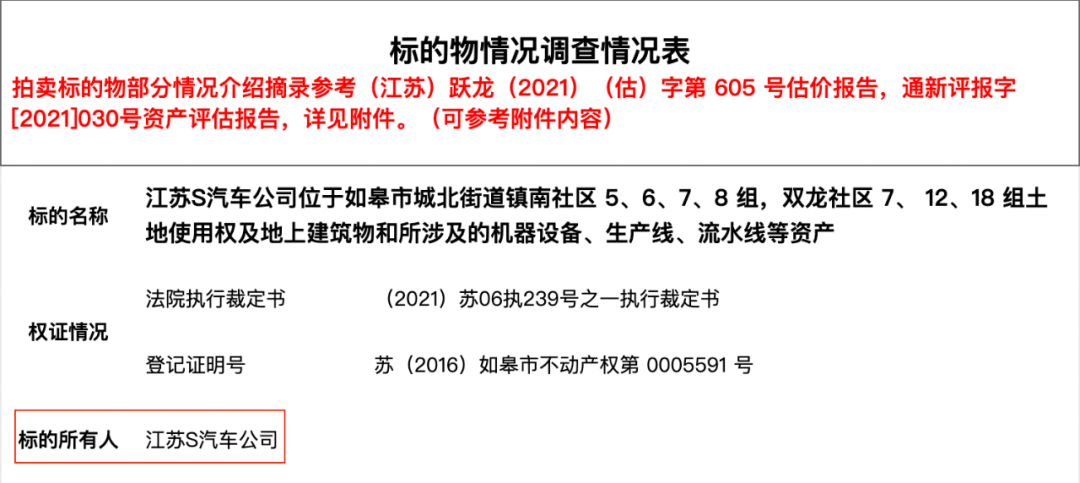 阿里拍卖官网显示,江苏南通中级法院对江苏S汽车位于如皋市的土地使用权、地上建筑物以及所涉及的机器设备、生产线、流水线等资产发起拍卖。