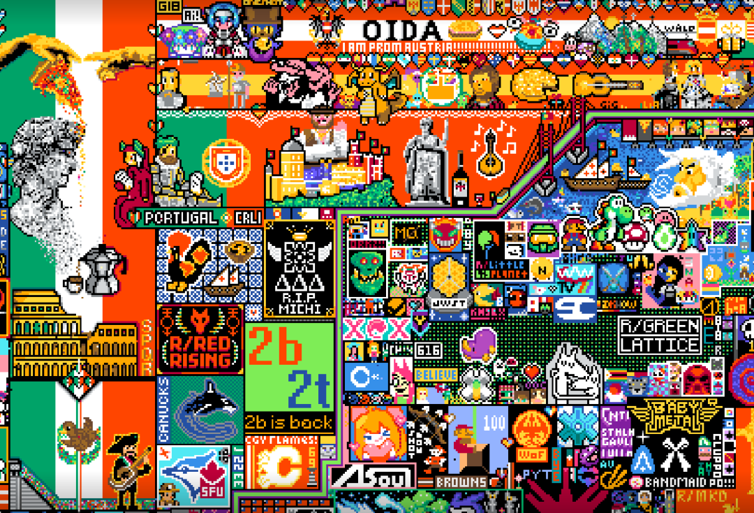 协作涂像素的人,大都属于某一个社群。而社群各式各样,难以归类。有的是一位说唱歌手的粉丝团,有的是一个电竞游戏玩家群,有的是 Reddit 某个子版块的用户,不过最为常见的还是国家。