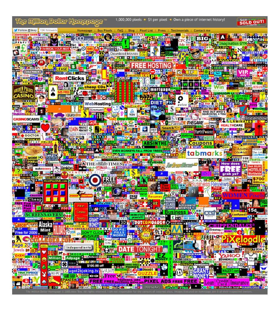 同样在 2005 年,21 岁的英国小伙子 Alex Tew 为筹集大学学费,突发奇想将一块 100 万像素的画布放在网站上,作为一块巨大的广告牌,任何人都可以用 1 英镑购买一个像素,将自己的商标和网站链接放在广告牌上。商标最小需要 10×10 的大小,所以整张画布也被分割出了许多 10×10 的像素块。