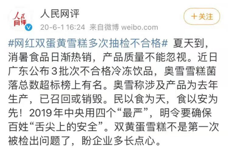 不只是钟薛高,奥雪“双黄蛋雪糕”在2019年的抽检中,被发现大肠菌群、菌落总数检测不合格,安全卫生状况堪忧。官方非但不正视问题,反而直接将锅甩给销售终端,说是冷柜温度不到位化冻导致,不是生产环节的错。
