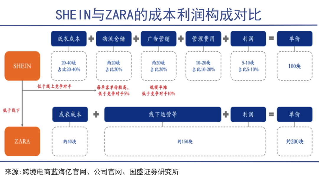 以1件普通的女装上衣为例,ZARA的价格约150-200元,而在SHEIN只要5-8美元,是 ZARA的1/3-1/4。