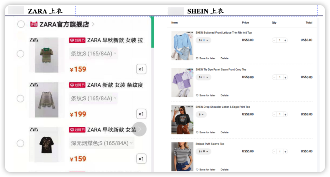 ZARA和SHEIN上衣价格对比,数据来源:天猫,SHEIN官网