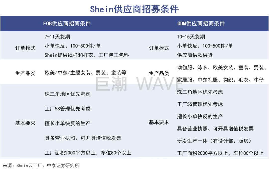 其中,FOB模式,即SHEIN负责设计和制作第一件样衣,然后由供应商包工包料完成生产;ODM模式中,供应商集研发生产为一体,拥有工厂和版房。