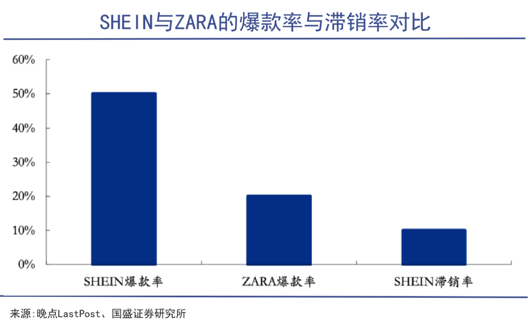 价格低廉,爆款却不少。由于SHEIN为纯线上销售,能够更好得进行大数据追踪和工业化设计,SHEIN对供应商的返单(对上次订货的重新定购)率高达80%,爆款率约 50%、滞销率仅约 10%,而ZARA爆款率仅为20%左右。