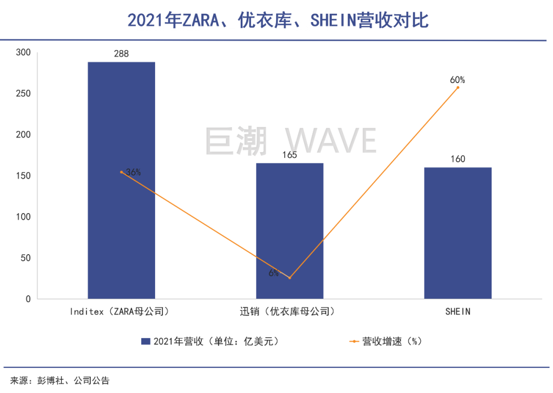 2020年,SHEIN年营收近100亿美元,连续第八年实现超过100%的增长。彭博数据显示,SHEIN 2021年销售额约160亿美元,增速已经大幅下滑至60%。这一年,Zara母公司营收约为288亿美元,优衣库母公司约为165亿美元。