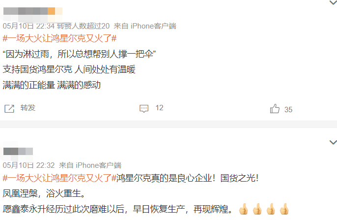 最近,一场大火又将鸿星尔克推上舆论高峰。4月底,鸿星尔克合作工厂鑫泰永升在当地火灾中受到波及,设备被损毁,产品也无法如期交付。品牌得知后,并未追究订单违约责任,而是第一时间协调人力物力救灾重建,帮助受灾工厂度过难关。消息一经报道,迅速引发了大范围讨论,并赢得了网友好评,诸如“国货之光”、“良心企业”等正面评价也让品牌声量再一次得到了提升。