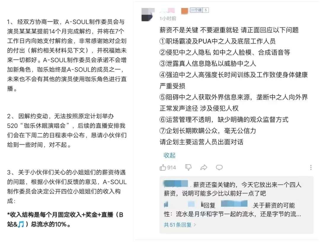 5月14日,A-SOUL官方就近期争议发布说明,否认存在“霸凌、压榨”等情况。但舆论环境并没有好转,评论认为其发布的收入结构(直播流水的10%)是刚刚更新的,而非长期以来的实际情况。目前,A-SOUL其他成员持续掉粉,直播弹幕满是“不会给资本买单”、“赶紧跑路”字样。